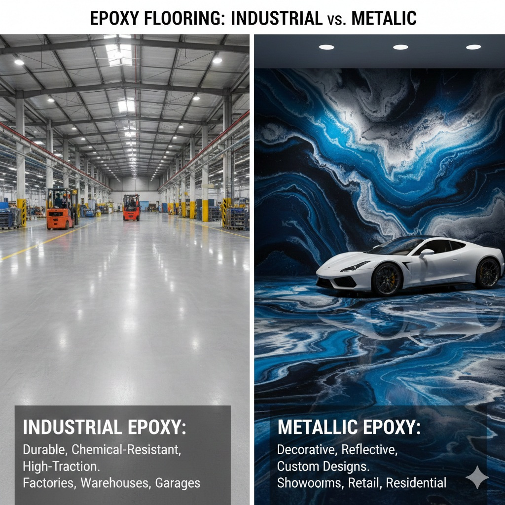 Industrial epoxy focuses on functionality, while metallic epoxy blends aesthetics with performance.